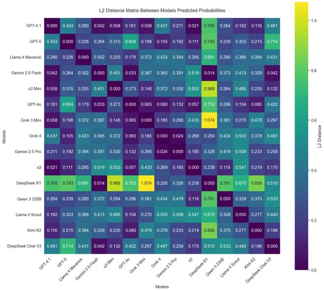 在频谱的另一端,诸如Grok-4和GPT-5之类的模型经常作出高度一致的预测,L2距离通常低于0.3。