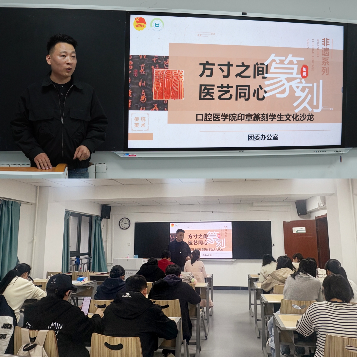 为传承中华优秀传统文化,提升学生审美素养与人文内涵,践行“锻炼口腔医学生灵巧的手”的育人主旨,10月24日下午,口腔医学院团委举办“方寸之间,医艺同心”印章篆刻学生文化沙龙,30余名本硕学生齐聚一堂,在方寸石章间体悟千年篆刻艺术的魅力,共度一段兼具文化韵味与实践乐趣的美好时光。 活动伊始,专业老师带领同学们追溯篆刻艺术的千年源流。从先秦古玺到秦汉印章,从实用信物到文人雅玩,详细解读了篆刻艺术“以印言美、以印言志”的文化内涵与“刀情笔趣载千秋讯息”的艺术特质。随后,老师现场解密篆刻工艺,演示石料选择、印面设计、执刀技法等关键步骤,深入浅出地讲解与直观生动地示范,让同学们快速掌握了篆刻的基础要领,跃跃欲试想要亲手创作。 进入实践环节,同学们按照指导开始设计印面、勾勒字形、执刀雕刻。从起笔的轻重缓急到运刀的转折顿挫,大家专注投入,在石章上精心雕琢。部分同学初遇困难时,便主动交流经验,在互帮互助中攻克技术难点。随着刻刀与石料的清脆碰撞声此起彼伏,原本朴素的石章逐渐显现出规整的字形与独特的韵味——篆体的婉转流畅、隶体的端庄厚重,不同字体在同学们手中呈现出别样风采,每一枚印章都承载着个性创意与文化敬意。完成雕刻后,同学们细细打磨、清理印面,亲手将自己的作品钤印留念,感受从原石到成品的蜕变喜悦。 本次篆刻活动是口腔医学院“美劳融合”育人理念的又一实践探索。育人先育心,学院围绕“体验-认知-锻炼-创造”的五育实践体系,将传统艺术实践与口腔医学人才培养需求相结合,既让学生在动手实践中锻炼了精细操作能力,又使其在文化浸润中提升了审美情趣与人文素养。同学们纷纷表示,在繁忙的课业之余,能沉浸式感受传统艺术的魅力,不仅放松了身心,更体会到中华优秀传统文化的深厚底蕴,也进一步增强了作为医学生的文化自信与职业认同感。 未来,团委将持续搭建多元化的文化实践平台,推出更多兼具专业性与趣味性的美育活动,助力学生在传承文脉中成长成才,培养既有精湛医术又有人文情怀的优秀口腔医学人才。 下一条:丝路刊群“格致论坛”暨2025年度出版专业技术人员继续教育培训第二期活动举办