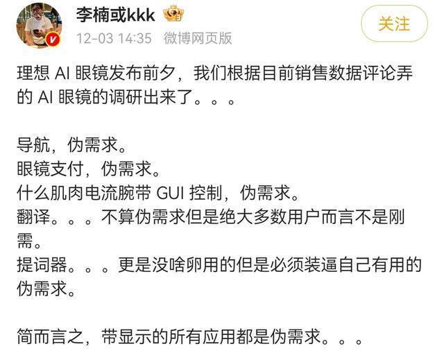 曾经在蔚小理阵营一骑绝尘的理想,如今却连续两个财季遭遇重创,不久前发布的三季报,更罕见巨亏超6亿元,而昔日追不上理想尾灯的小鹏和蔚来,如今一个销量稳健增长,一个看到了盈利希望 叠加高端电车市场鸿蒙智行头号种子选手问界的一马当先,中高端电车市场小米的势如破竹和亲民级电车市场零跑的大比分领跑……新势力江湖,围绕尖子生理想的掉队言论已此起彼伏~ 恰逢AI掀起的技术革命如火如荼,雷军更是直言所有行业都值得用AI重做一遍!众科技巨头无不绞尽脑汁抢夺AI最佳硬件入口,豆包自研AI手机的出圈,再一次让AI的入口焦虑蔓延 李想选择对抗焦虑的方式是主动出击,于是我们看到了理想AI眼镜的落地,虽然远无法媲美全民刚需级的智能手机,但至少让理想的宏大AI叙事有了新载体,只不过,半只脚踏入消费电子行业的理想,又将直面华为、小米等巨头的竞争。 12月3日,理想正式发布首款AI眼镜 Livis,有多款配色,且全系标配蔡司镜片,并提供屈光、感光变色、墨镜等版本,售价仅1999元起,1999对所有科技数码发烧友而言都是一组如思想钢印般的经典数字,李想对这款产品的厚望从定价的心思或可窥一斑。 据理想介绍,Livis首发搭载理想自研的 Deep Research,支持多模态感知和空间音频录制,可实现0.8秒响应对线秒解答难题,与车机无缝互联等功能 ,对于理想车主而言,这款产品倒算得上是最佳AI配件,对非车主的大众消费群体而言,它有何竞争优势? 具体来看,36克的镜身重量算是一个亮点,适合长时间佩戴,另外理想官宣这款眼镜能维持18.8个小时的续航,如果消费者实际体验下来与这个成绩大差不差 ,那在续航体验方面,无疑是超过了一众最高不超过8小时的竞品的,另外蔡司的镜片算是一个加分项。 值得一提的是,魅族前副总裁李楠表示,在理想AI眼镜发布前夕,他们根据最新的销售数据评论弄的AI眼镜的调研就出来了:导航 、眼镜支付、提词器、肌肉电流腕带GUI控制等皆是伪需求,简而言之,带显示的所有应用都是伪需求,翻译不算伪需求但绝大多数用户而言不是刚需。 李楠的调研结论与笔者开篇的观点基本一致——AI眼镜或者当前任何AI消费产品,都远远无法替代智能手机,所以,纵使包括小米、华为、影目、Rokid、阿里、雷鸟创新、百度等一众玩家已推出类似的产品,在销量上也远远不敌智能手机新品的九牛之一毛。 核心逻辑不复杂,或许AI、AR眼镜能锦上添花,但却无法像智能手机一样雪中送炭,包括新能源汽车、人形机器人等在内,在AI生态入口的重要性上都远逊于智能手机,但是理想毕竟不是手机巨头,所以,先让AI眼镜落地也体现了其务实性。 以及,全球智能眼眼镜市场仍然有一定的增量想象空间,来自IDC的预测显示,2026年,全球智能眼镜市场出货量将突破2368.7万台,其中中国智能眼镜市场出货量将突破491.5万台(此注的智能眼镜,包括AI、AR、XR等等形态)。 所以,如果从利润贡献角度,对理想而言,可以忽略不计,甚至,Livis生命周期的销量都未必能摊销该项目的研发成本,但是,你如果不提前布局,未来这一市场真的到了所谓的iPhone时刻,你连上桌分肉的机会都没有。 所以,没有更好的AI新入口之前,Livis是理想为数不多能押注的AI硬件赛道了。 在数月前的罗永浩访谈节目中,李想坦言目前理想已经有了5万卡(GPU集群)的规模了,预计今年(2025)将投入120亿元的研发,其中针对AI领域的投入将超过60亿元。 最新消息还显示,理想公司自主研发的M100芯片正在进行大规模系统测试,预计2026年将进入商业化开发。 如此巨大的投入和在芯片、大模型等智慧成果方面的产出,足见李想对AI的野心,绝不仅仅停留在智能汽车、智能眼镜等智能终端上,包括大热的具身智能机器人,都是理想必然要攻克的产品高地。 但就在理想按既定节奏推进时,赖以生存的核心主业汽车业务频遭黑天鹅。李想的AI蓝图,陡生变数…… 日前,理想披露了2025年三季度财报,营收273.6亿元,同比下滑36.17%,该季交付量仅为93211辆,同比大幅下滑39%,净亏损6.24亿元,意味着连续11个季度盈利的骄人记录自此打破,其中,MEGA车型的召回产生了约11亿元的一次性成本,不仅影响了毛利率,还对品牌信任度造成了不可估量的伤害。 超高端MPV电车MEGA2024款的大规模召回,源自于上海一起MEGA起火事故,理想迅速进行查漏补缺并定因,指向——冷却液验证不充分,动力电池试验验证及渗漏风险评估不充分,研发运营-研发质量、质量安全、服务等部门相关人员在冷却液渗漏风险评估、用户车辆处置等环节存在应对不当 冰冷的财报叠加MEGA事故,引发了车圈不少大V对理想研发体系乃至管理体系的质疑,比如有汽车博主称杀员工祭天的做法,更像是一场公关表演:试图通过牺牲底层员工来转移公众对组织的质疑。但这会寒了所有在职工程师的心,——无论流程多不合理,最终背锅的总是干活的人。 经过连番的打击之后,李想罕见公认错,2025年11月底的第三季度财报电话会上,李想就公司经营状况和管理方式进行公开反思和认错,承认管理模式失误,对经营业绩不善负责。尤其在管理模式层面,李想果断出手,开始了彻底的去华为化。 11 月的组织公告则完成终极收尾:组织部与人力资源部整合,理想元老杨海山出任负责人并直接向李想汇报,李想首次亲自直管人事。 核心华为系高管同步离场:负责组织变革的李文智、人力资源负责人袁春峰相继离职,至此
